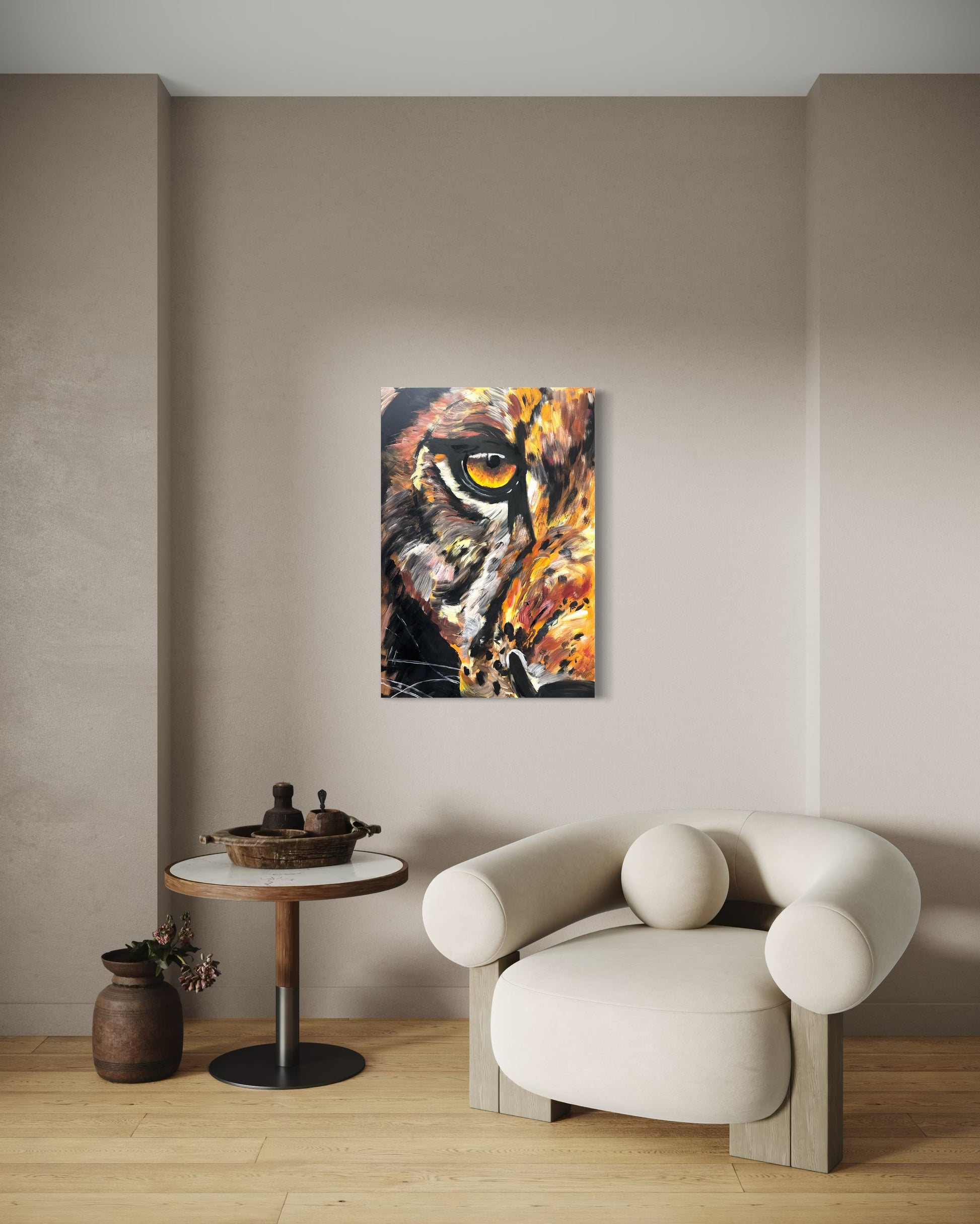 "Lion's Eye" fängt die Kraft, Würde und Wildheit des Löwen in einem einzigen, intensiven Blick ein. Der Fokus auf das Auge, kombiniert mit dynamischen Pinselstrichen und leuchtenden Farben, verleiht dem Bild eine fesselnde Tiefe und Präsenz. Jeder Farbverlauf spiegelt das Feuer und die Seele des Tieres wider.