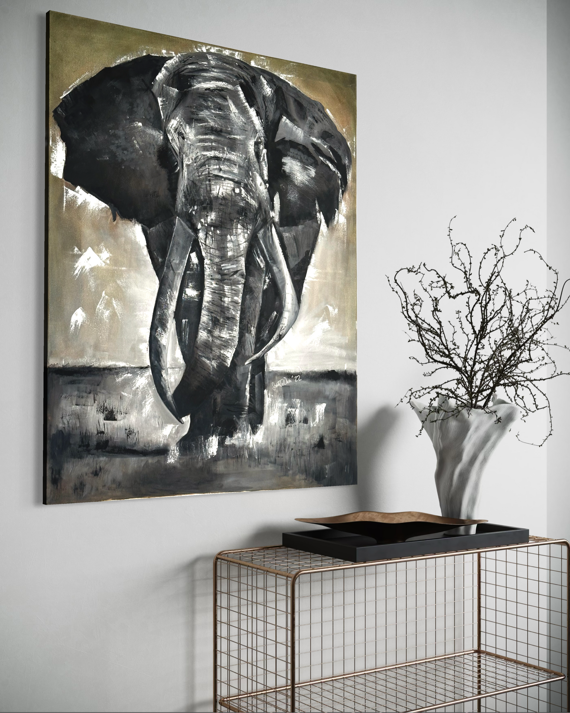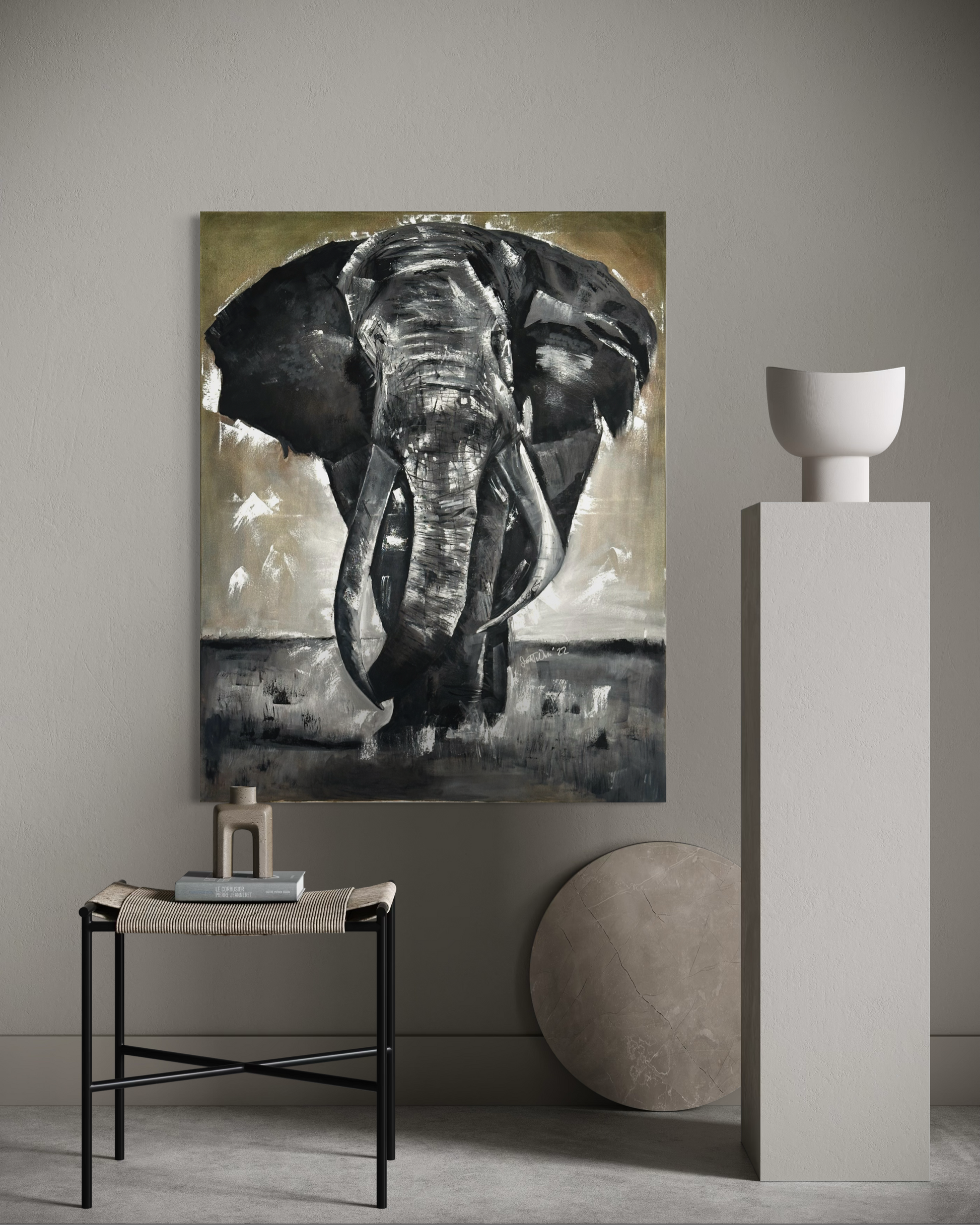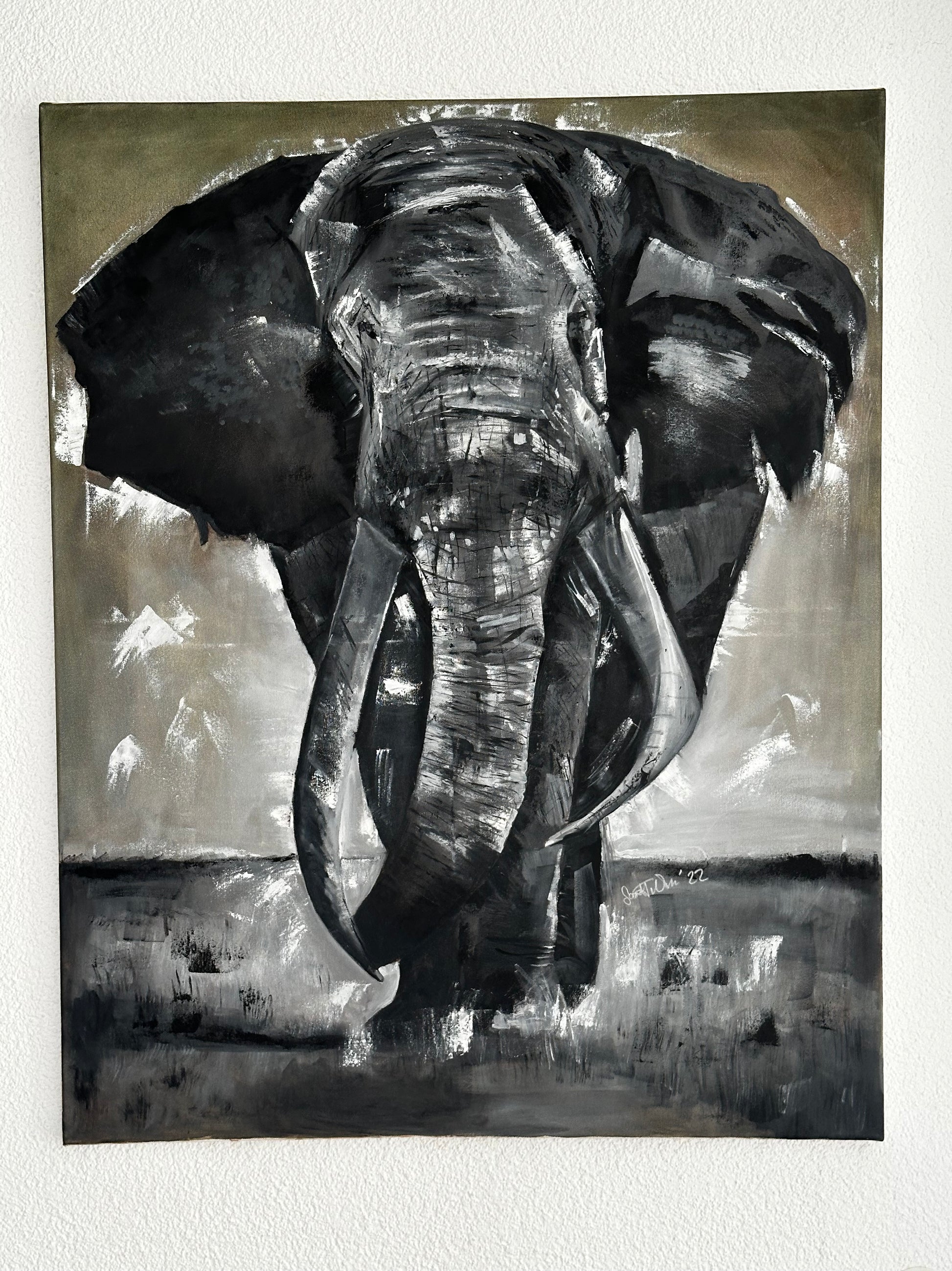 Ein Elefant frontal, monumental und roh dargestellt – nicht als Deko-Motiv, sondern als Charakter. Die groben Pinselspuren und die reduzierte Farbigkeit wirken wie Narben: Spuren von Zeit, Druck und Erfahrung. Das Tier steht wie ein Symbol für Stärke, die nicht laut sein muss – und für eine Ruhe, die man sich erst verdienen muss.